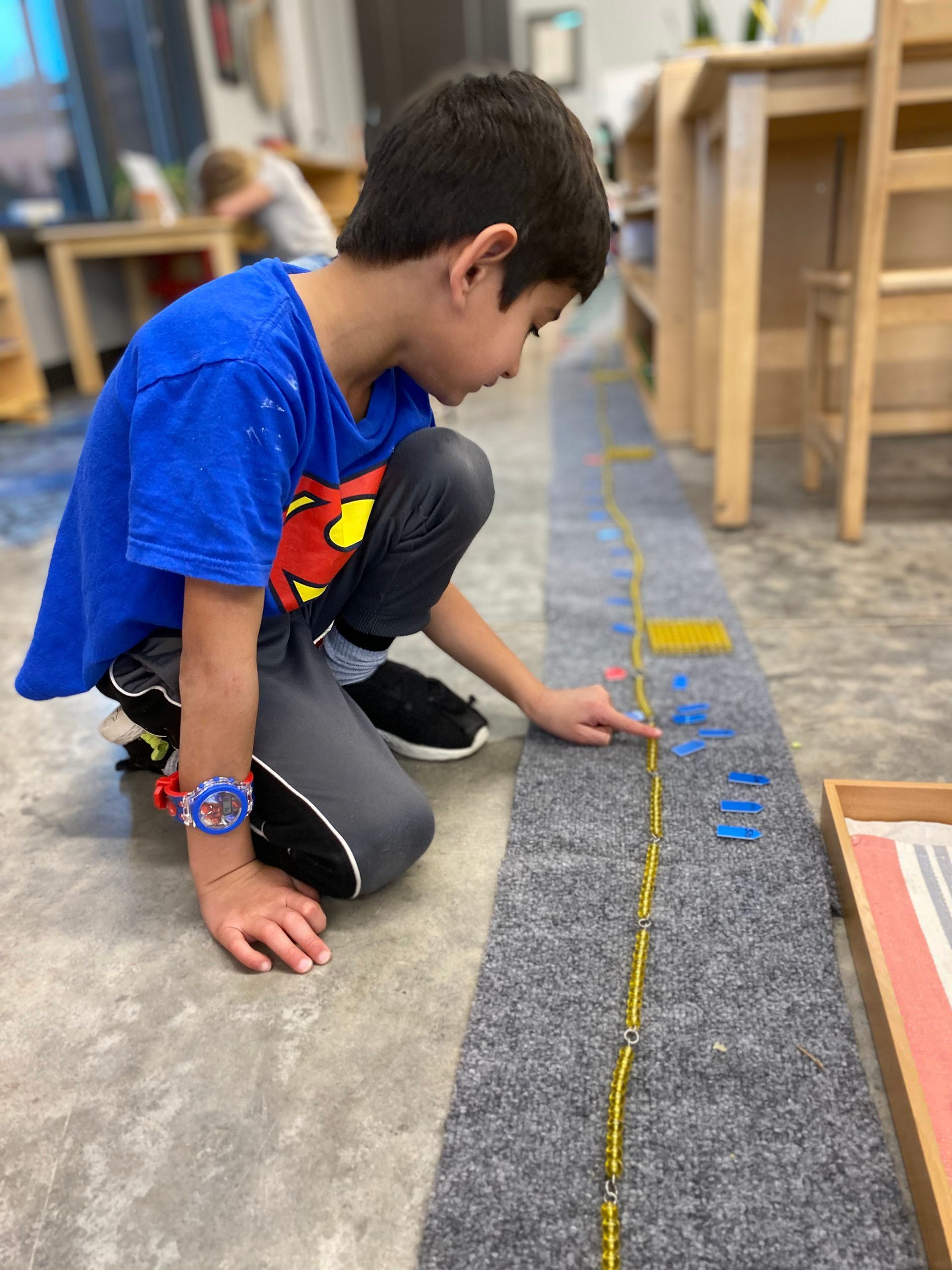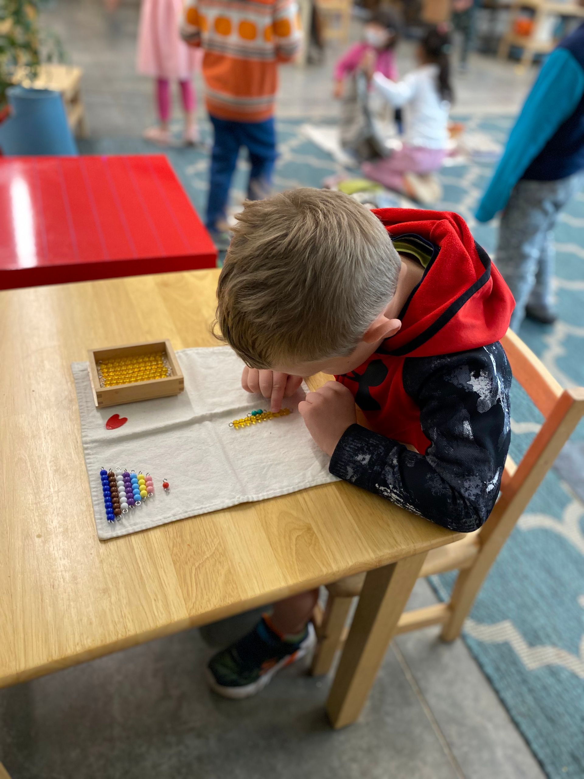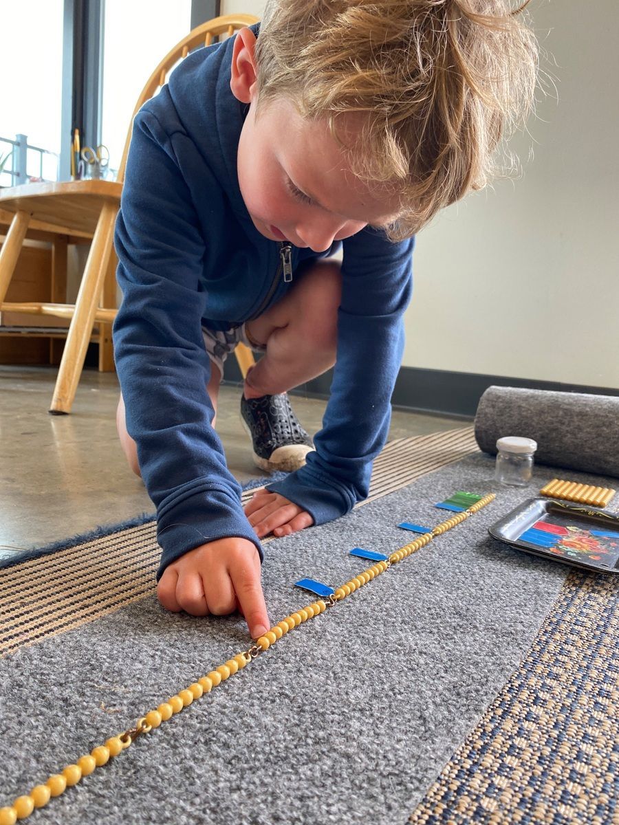 In our primary classrooms, you will find a large, wooden cabinet with colored bead bars hanging both vertically and laying horizontal. We call this the Bead Cabinet and it houses the coveted chains! The Chains are a long awaited work for many primary children. The tiny, intricate, colored beads draw the child's eye. Fragile and beautiful, children are anxious to touch them. The Short Chains of the cabinet represent the square of each number, 1-10, and the Long Chains represent the cube of each number, 1-10. Each Chain also has corresponding labels, allowing the child to count the beads on each bar that makes up the Chain and place the corresponding label in the correct spot at the end of each segment. For each Chain, only the first labels that make up the initial bar are present. After the initial bar is counted the remaining labels available are only for the end of each bar. For example, the Short 5 Chain will only have tickets for the following numbers: 1, 2, 3, 4, 5, and then 10, 15, 20 and 25. Visually, the child will see the factors of 5-squared.
