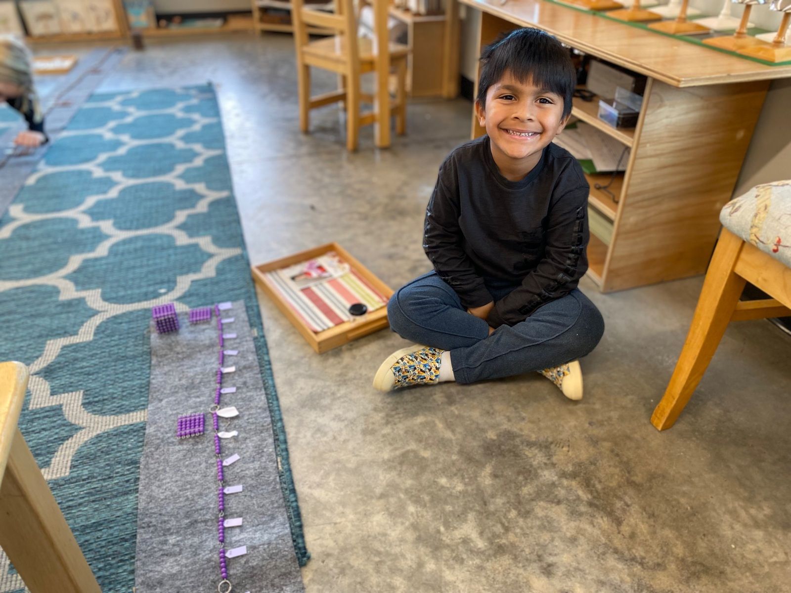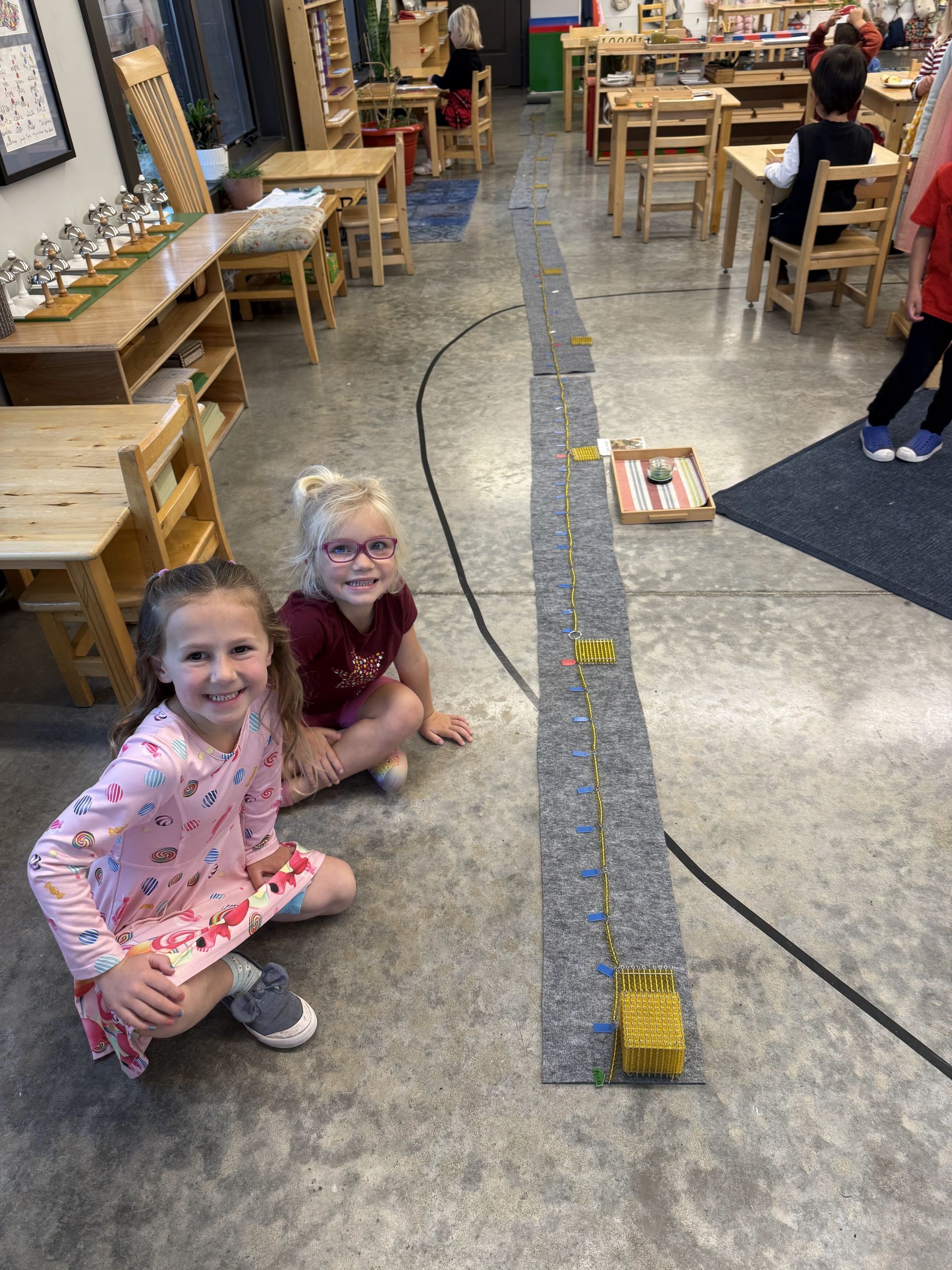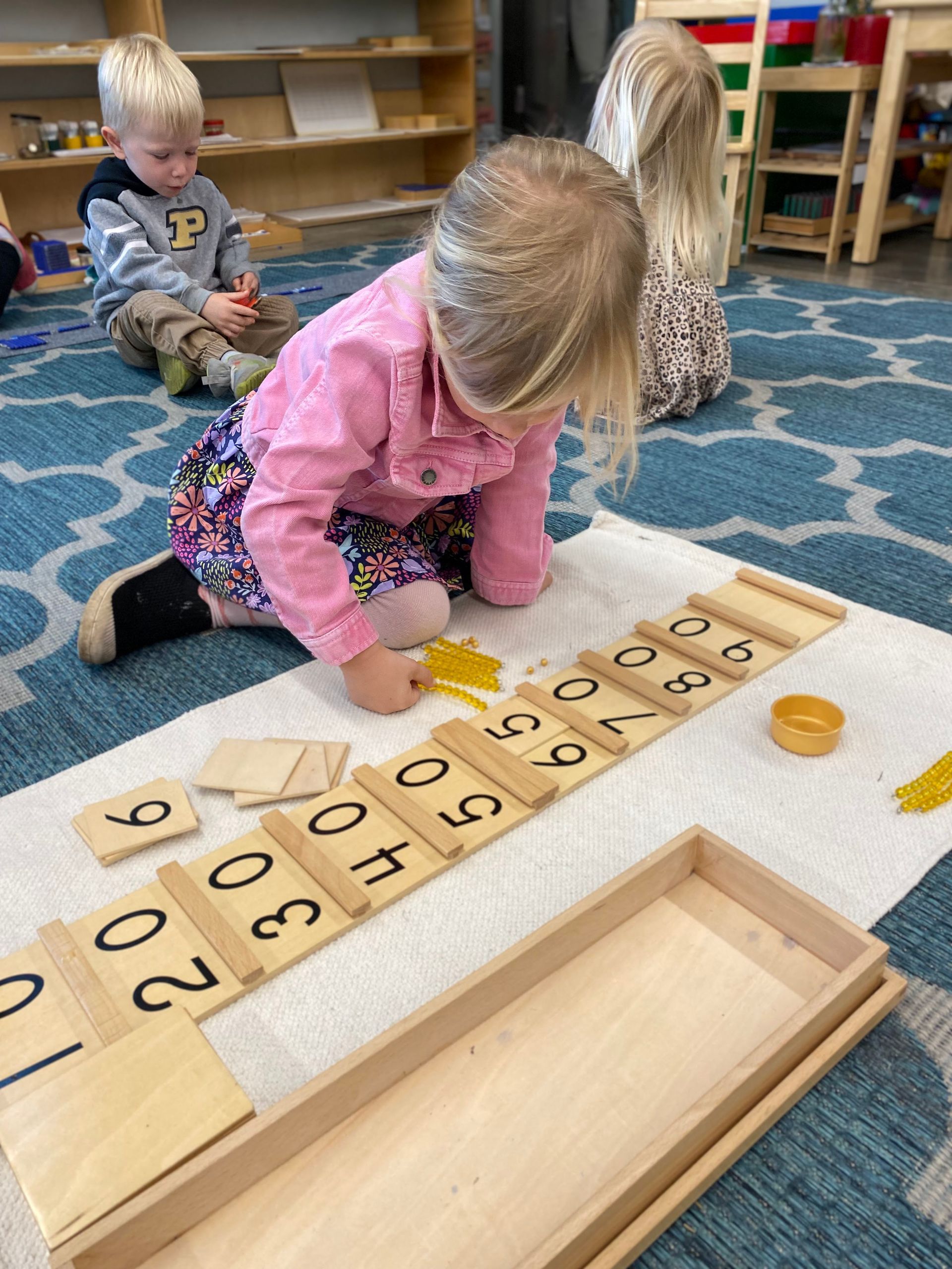 In our primary classrooms, you will find a large, wooden cabinet with colored bead bars hanging both vertically and laying horizontal. We call this the Bead Cabinet and it houses the coveted chains! The Chains are a long awaited work for many primary children. The tiny, intricate, colored beads draw the child's eye. Fragile and beautiful, children are anxious to touch them. The Short Chains of the cabinet represent the square of each number, 1-10, and the Long Chains represent the cube of each number, 1-10. Each Chain also has corresponding labels, allowing the child to count the beads on each bar that makes up the Chain and place the corresponding label in the correct spot at the end of each segment. For each Chain, only the first labels that make up the initial bar are present. After the initial bar is counted the remaining labels available are only for the end of each bar. For example, the Short 5 Chain will only have tickets for the following numbers: 1, 2, 3, 4, 5, and then 10, 15, 20 and 25. Visually, the child will see the factors of 5-squared.