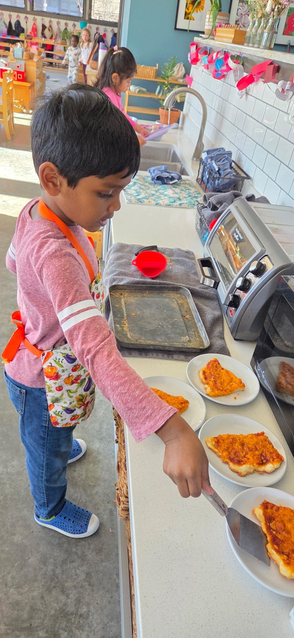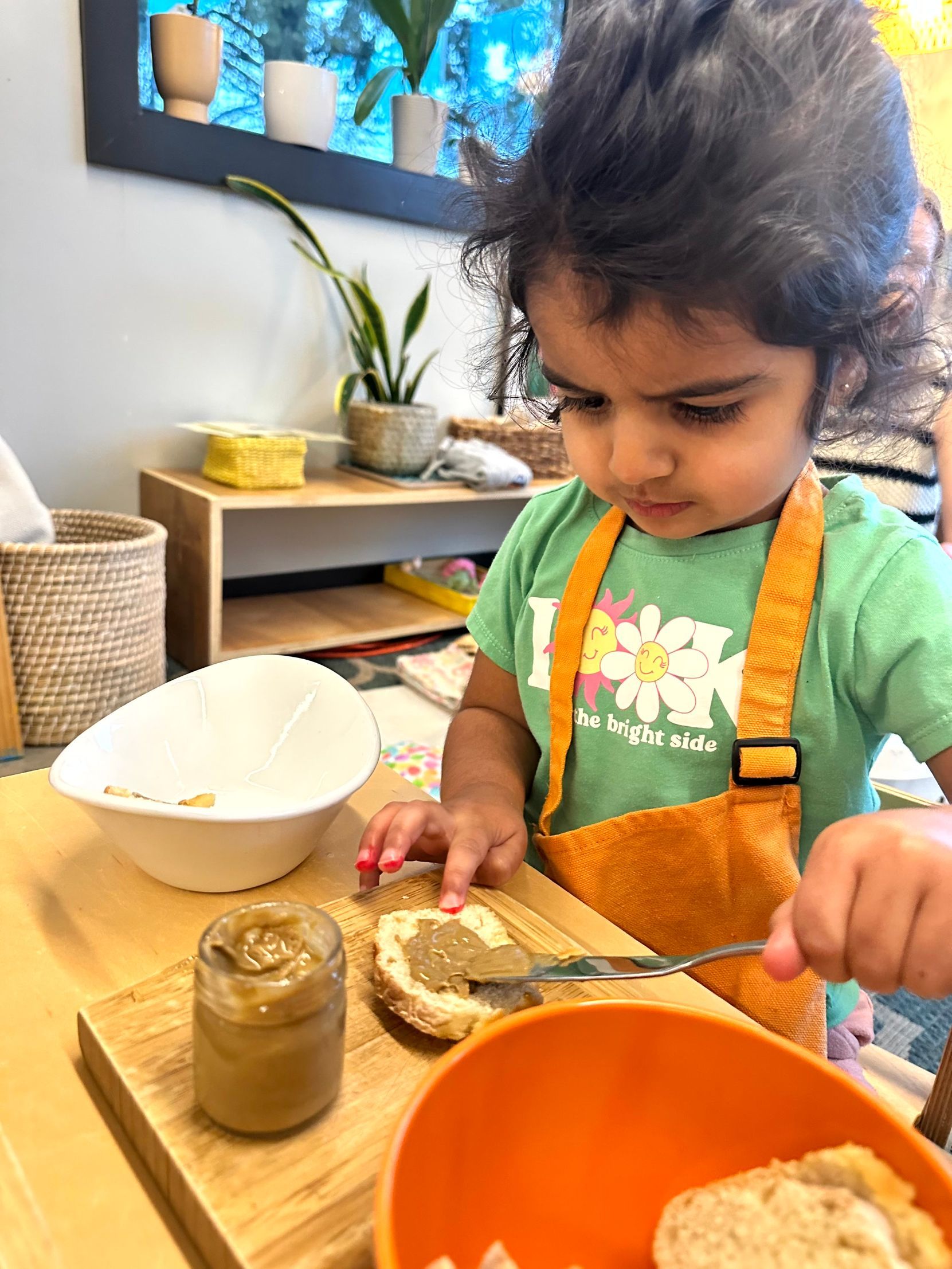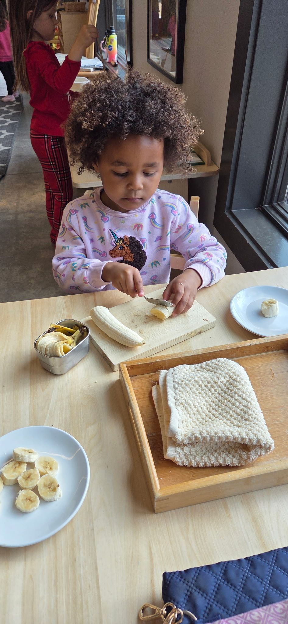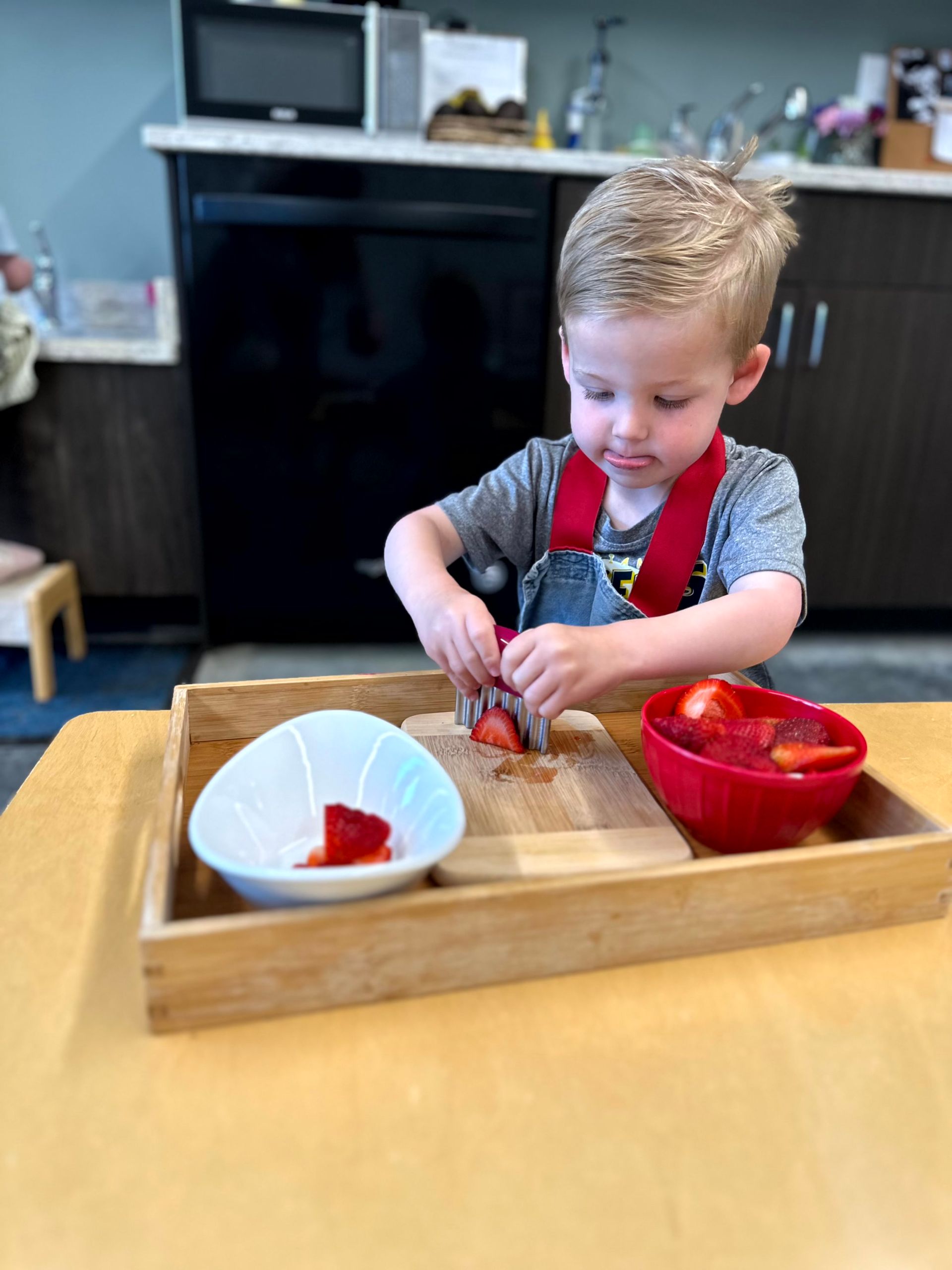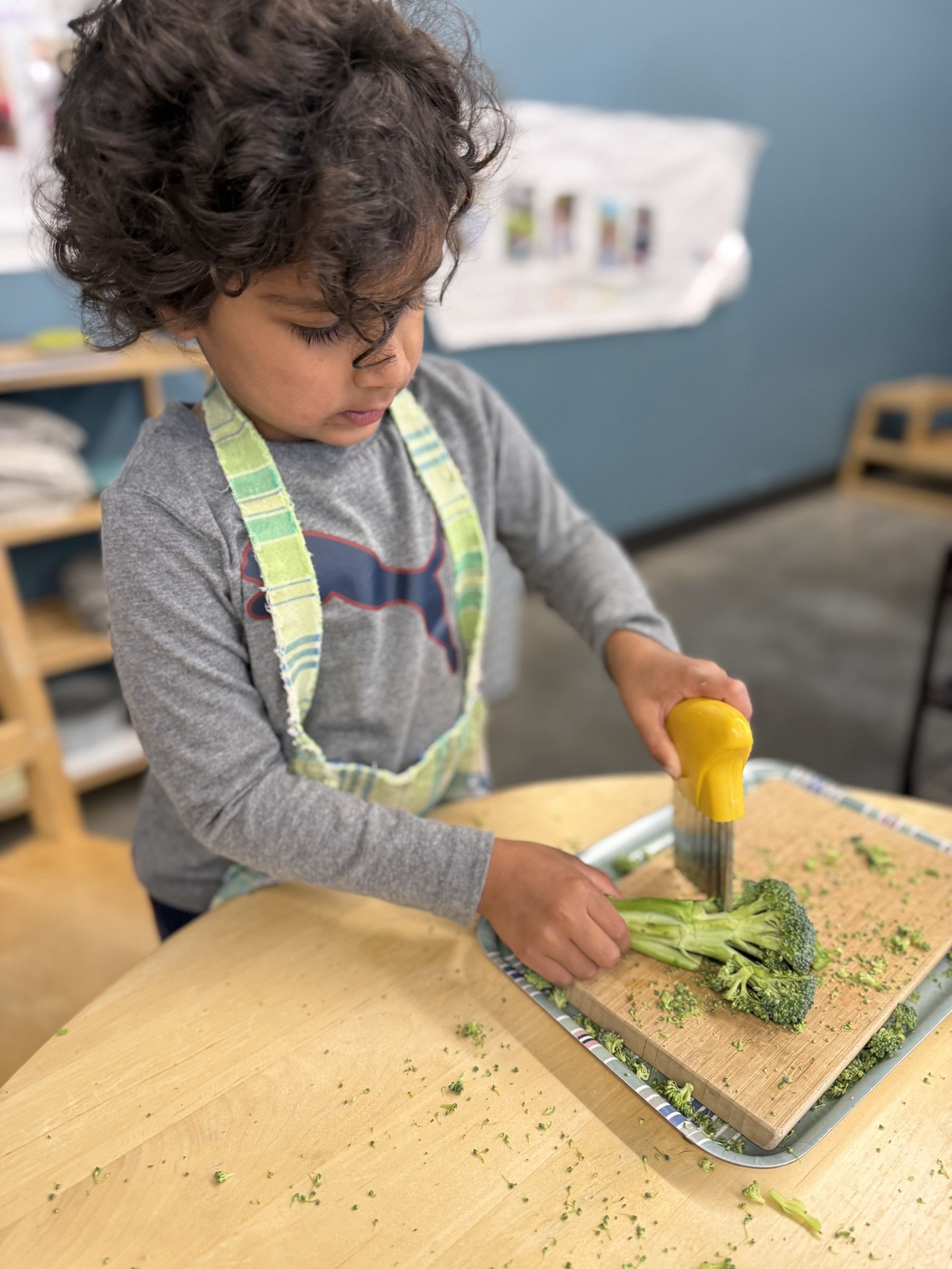 In our Montessori classrooms, children engage in real, purposeful work. Food preparation is more than just making a snack—it provides opportunities to develop fine motor skills through slicing, peeling, pouring, and spreading. Following step-by-step tasks enhances concentration and focus, while the ability to prepare their own snacks and meals fosters independence. Exposure to a variety of fresh foods encourages healthy eating habits, and working together to prepare and serve food helps build social skills. Additionally, cleaning up after themselves instills a sense of responsibility and care for their environment.