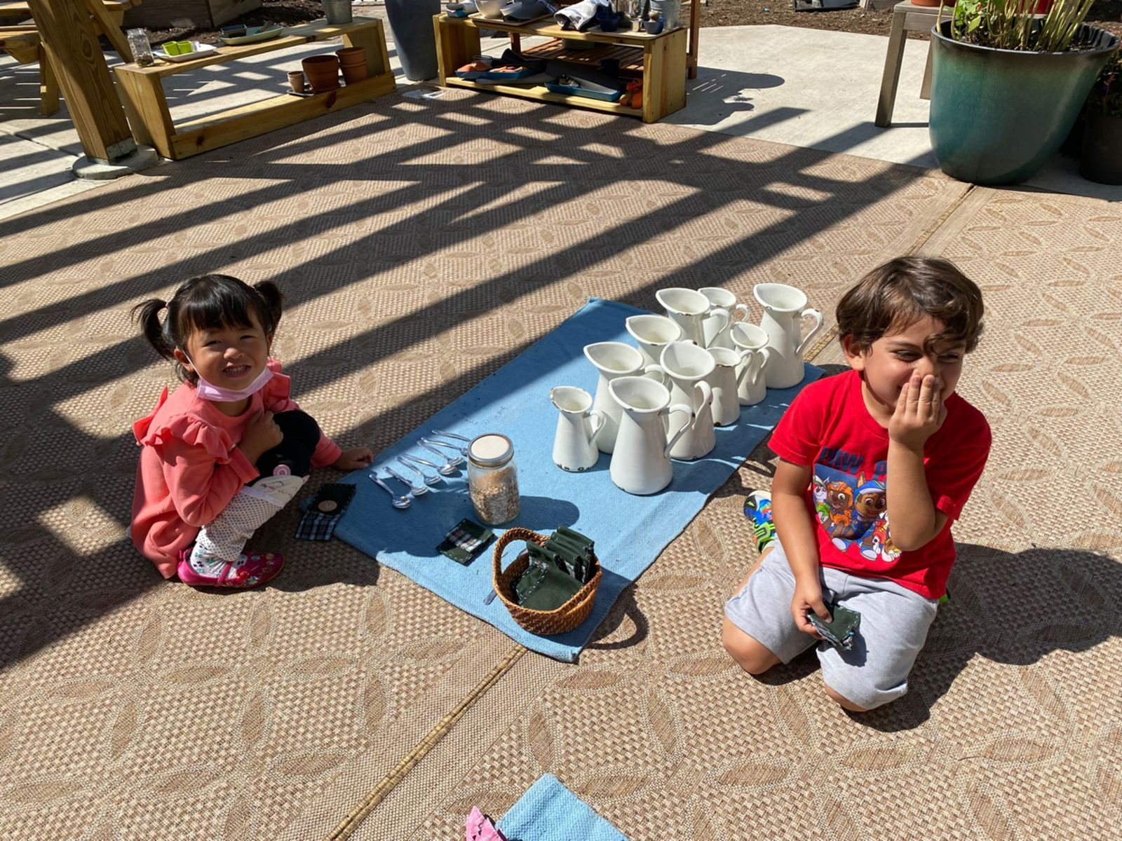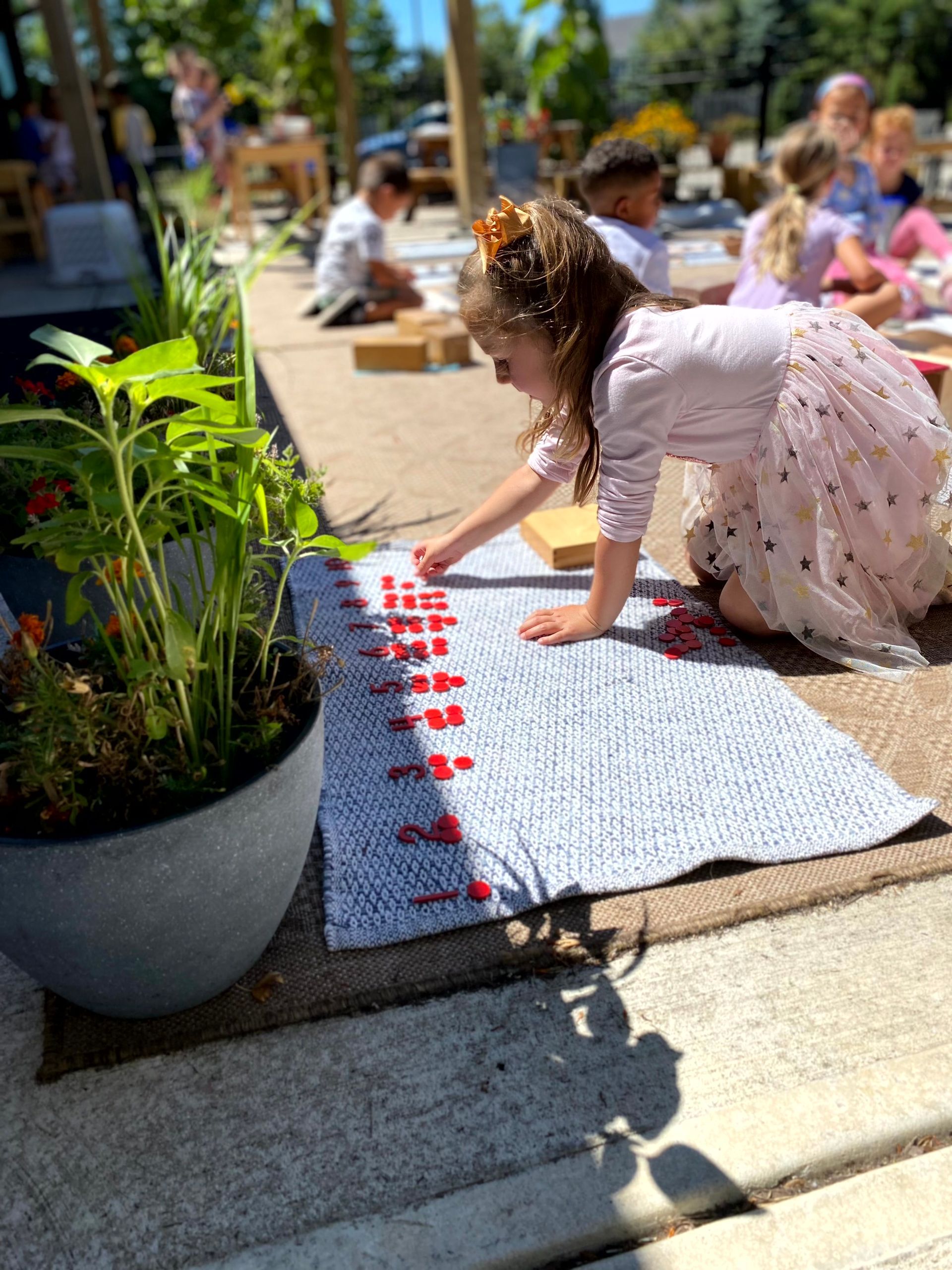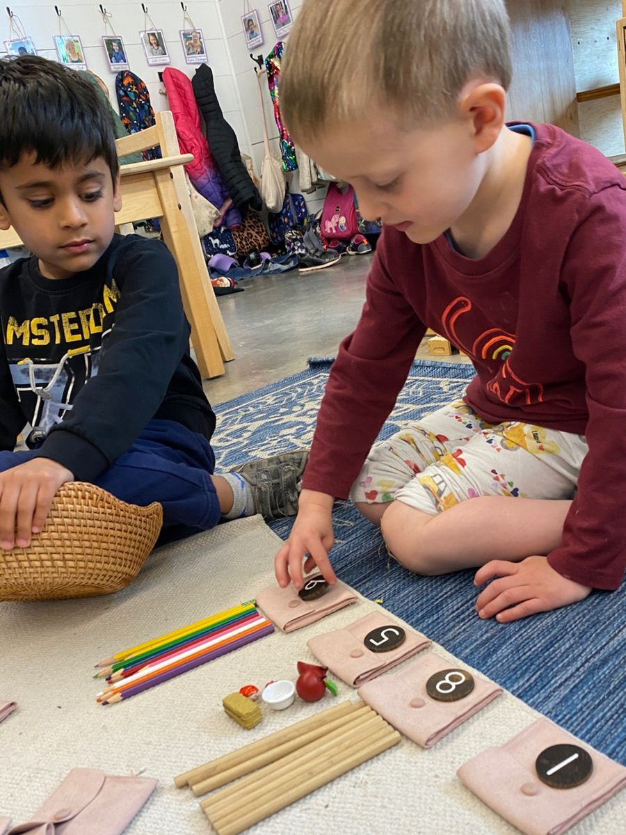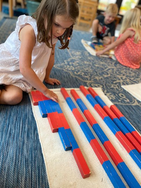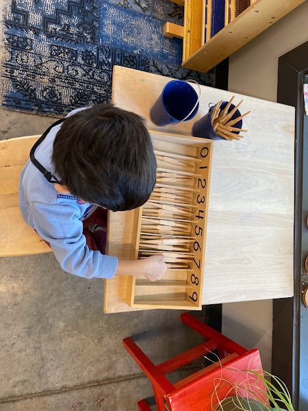 The Montessori Primary Classroom is when the child first gets an introduction to formal mathematical materials. Given that everything in the classroom is designed for children aged 2.5 to 6 years of age, the material is concrete. The child's first formal introduction to math is through the use of materials in what we call Group One of Math. Group One consists of materials that work on gaining experience with 1:1 correspondence, number recognition for numerals 0-10, understanding the concept of 0, and sequencing numerals 1-10. After these concepts are mastered, children are then introduced to materials that combine these concepts. Similar to most work in the classroom, we give the child the introduction and experience with concrete representation of a quantity before introducing the symbol. Using the math materials, the child's first lesson begins simply with counting and obtaining the vocabulary of numbers 1-10. This is then followed by number recognition. The child needs to know what four is to better aid them in understanding what the symbol for 4, looks like. The child can better retain the graphic symbol of 4 when they know what four represents. The adult's language is, "This is four." versus "This says four." Once the vocabulary, counting and number recognition are secure, then, the 1:1 correspondence is established. These first few lessons are presented with the Number Rods, the Sandpaper Numbers and the Number Rods and Cards. The child will then begin work with the Spindle Boxes, Cards and Counters and end with the Memory Game of Numbers. The children are so excited to begin their math journey with these materials!