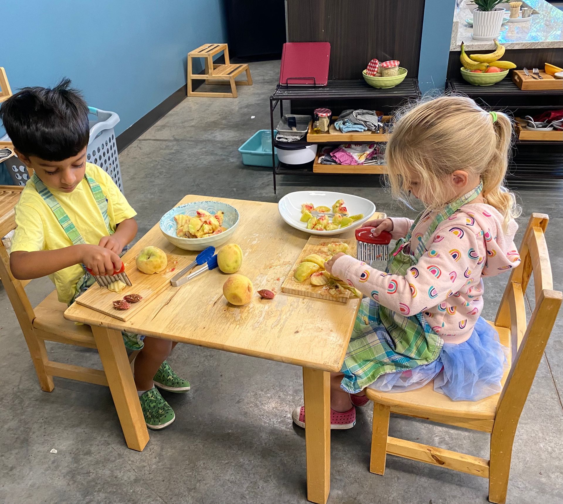 In Montessori classrooms, children are placed together with children of other ages. The children are encouraged to use each other as resources versus continually going to an adult for guidance. Therein lends tremendous value for the children's development. The younger children learn from the older children and find role models. They have opportunities to strengthen their communication and observation skills. In turn, the oldest children obtain valuable character traits such as affirmation of knowledge and the building of self-esteem and confidence. Often the collaboration blossoms in simply working on a material or project together. This collaboration occurs naturally in the environment and lends to the harmony of the classroom. Later in life, Montessori children take this naturally practiced skill and continue to enhance the attributes of collaboration on school projects, work teams, university studies and finally professional cohorts.