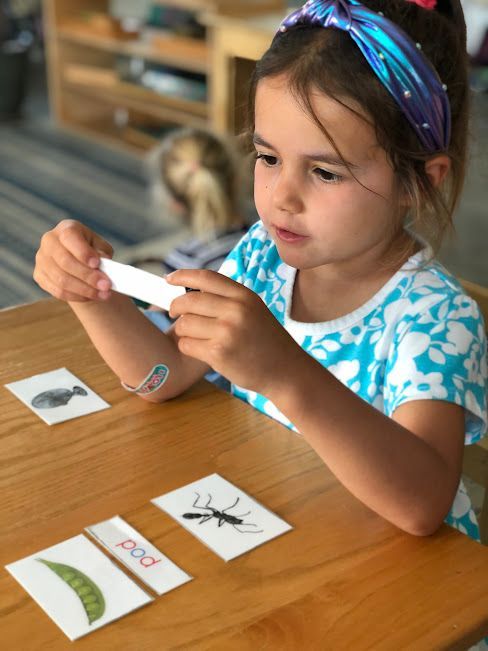 The reading sets of nomenclature cards include three pieces: the picture, a word label with the name and a card with both the label and picture. These are introduced individually to the child. Remember at this point the child has already learned the names of this set. The picture cards are named and laid individually on the work rug. Next the child reads each label and places it with the corresponding picture. The last piece of the set, with the picture and label, is used as a control card. The child is then able to check the work to verify the correct label was placed with the corresponding picture card.