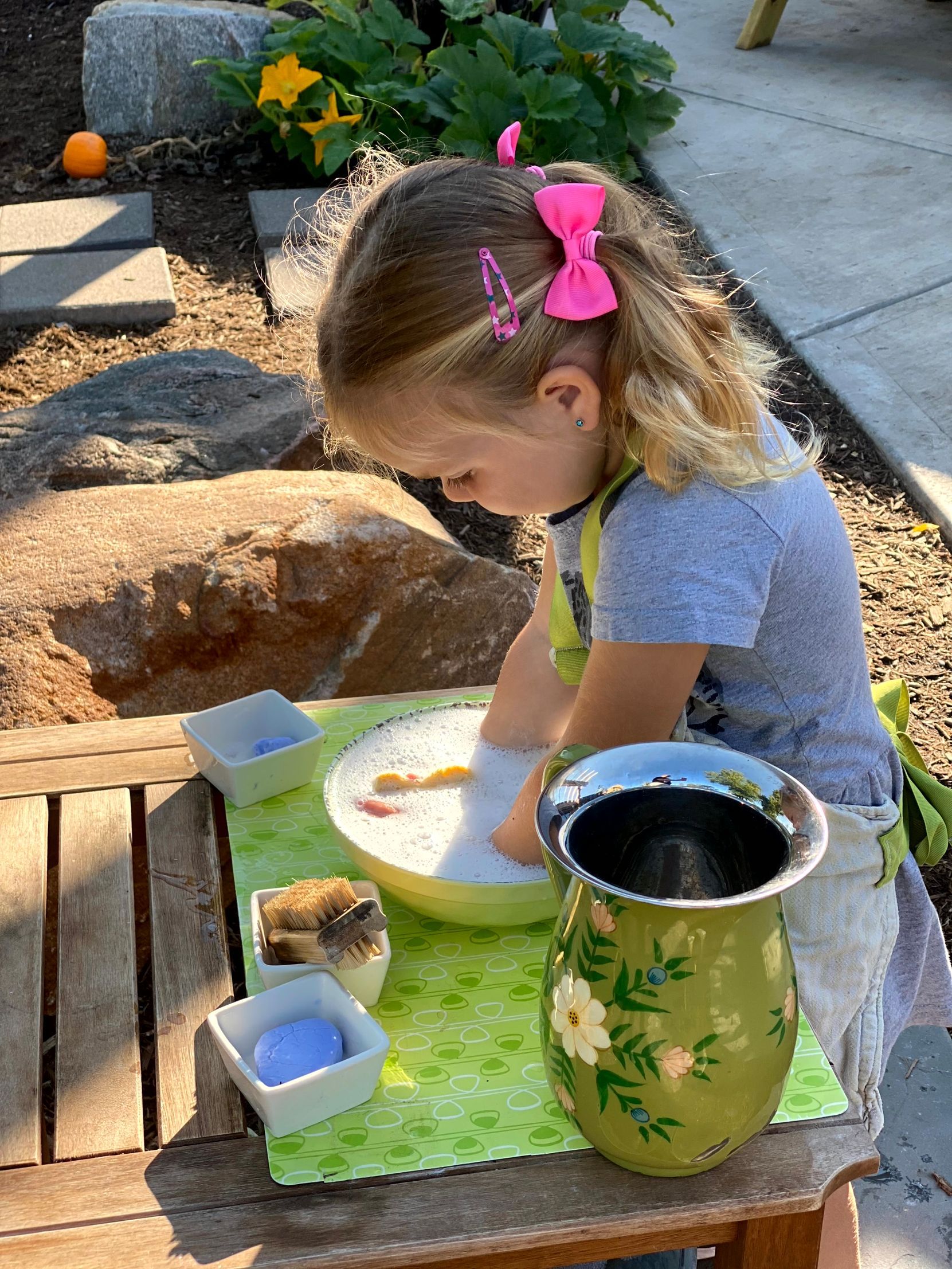 The children in the Montessori classroom love their work. The materials are meant and designed to be enticing; it's meant to be touched and manipulated. Everything in the Montessori classroom is real. We use real choppers, pitchers, fabric and wash bins. The material is all real and it's all purposeful.