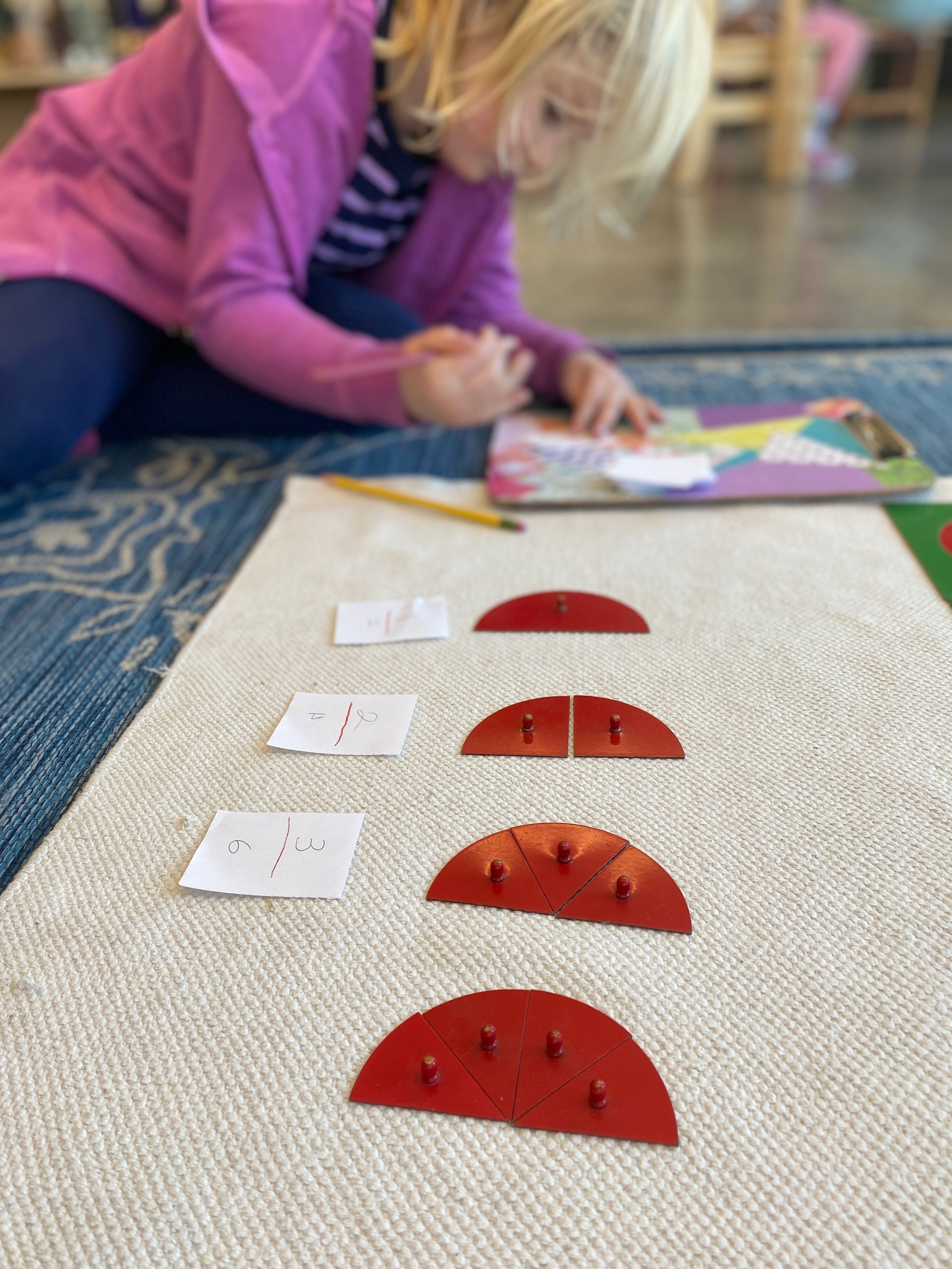 - Fraction Circles are linked directly to early sensorial materials, such as the Constructive Triangles and Geometric Solids, as they encourage children to explore parts of a whole. The precision and pattern recognition gained through the Constructive Triangles enable children to better grasp fractions and their relationships, forming the basis for an intuitive understanding of measurement.