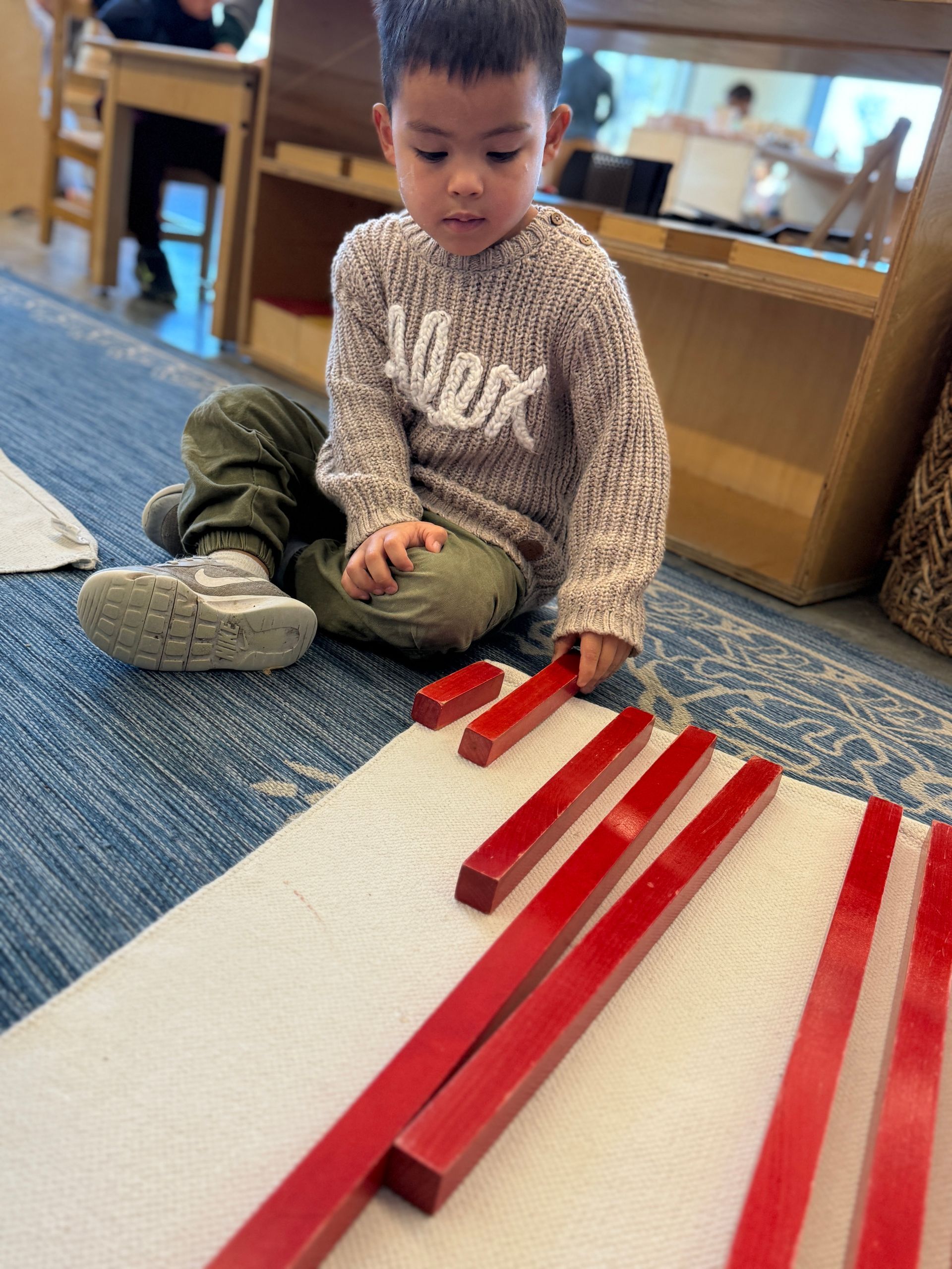 Once children have developed their ability to categorize, compare, and recognize patterns, they transition into more abstract mathematical concepts using the Montessori Math materials. Many of these materials mirror Sensorial materials in form and function, creating a seamless progression from concrete experiences to abstract mathematical understanding.