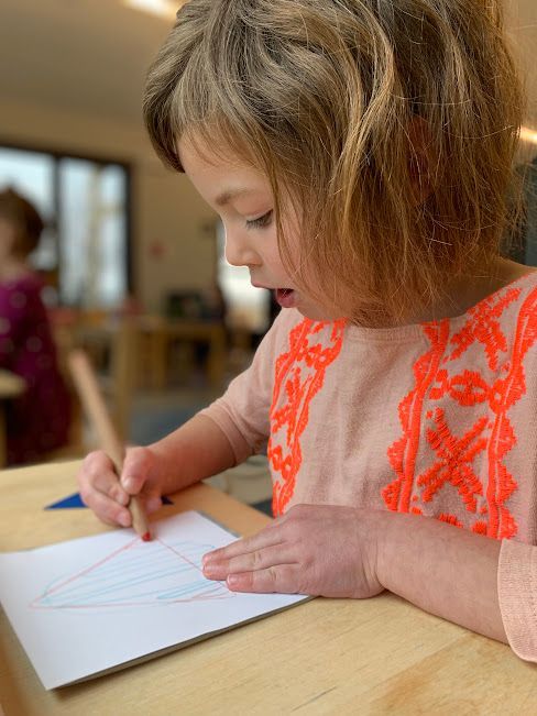 Long before they are ready to write a story (or even a word!), Montessori children begin learning how to carefully manipulate a pencil. The metal insets are a beautiful material that were designed specifically to prepare the hand for writing. While the shapes in the material are reminiscent of a geometry lesson, that is not the primary intention. What’s meant to be the focus is the teaching of a variety of handwriting skills, including pencil grip, applying appropriate pressure, moving the pencil left to right, and further strengthening the muscles of the hand to build stamina.